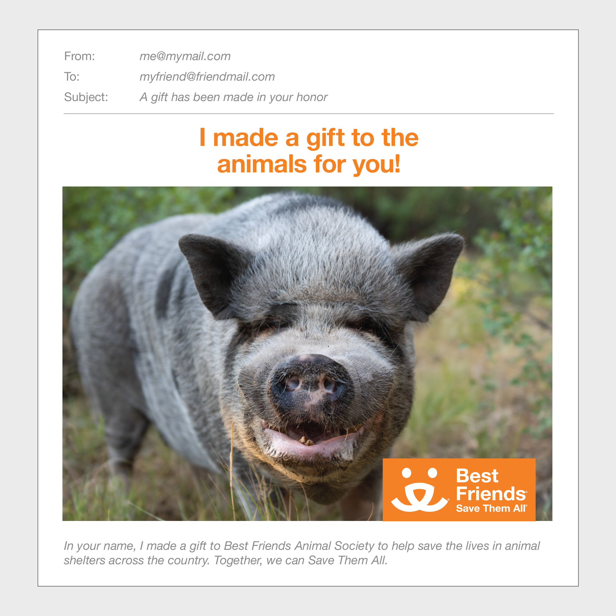 Your sponsorship gift supports the work of Best Friends Animal Society and helps Save Them All. To assist the greatest number of animals in need, and to make sure your gift does the most good, your donation will be used in combination with other sponsorship gifts to help save the lives of animals.