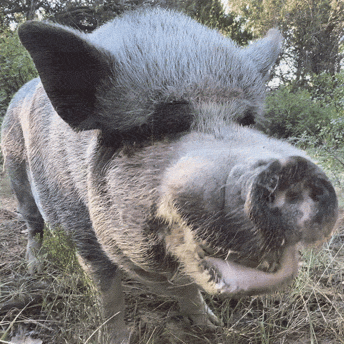 Yum! Peanuts and banana chips are Batman’s favorite training rewards. This pig really loves to learn — when it involves treats. Before arriving at the Sanctuary, he was found hobbling alone down the highway. We gave him immediate veterinary care for his painfully overgrown hooves and tusks. Thanks to tender, loving care, Batman now follows his caregivers around and stands still during medical treatments like acupuncture. He has even begun to let us clean his cute,