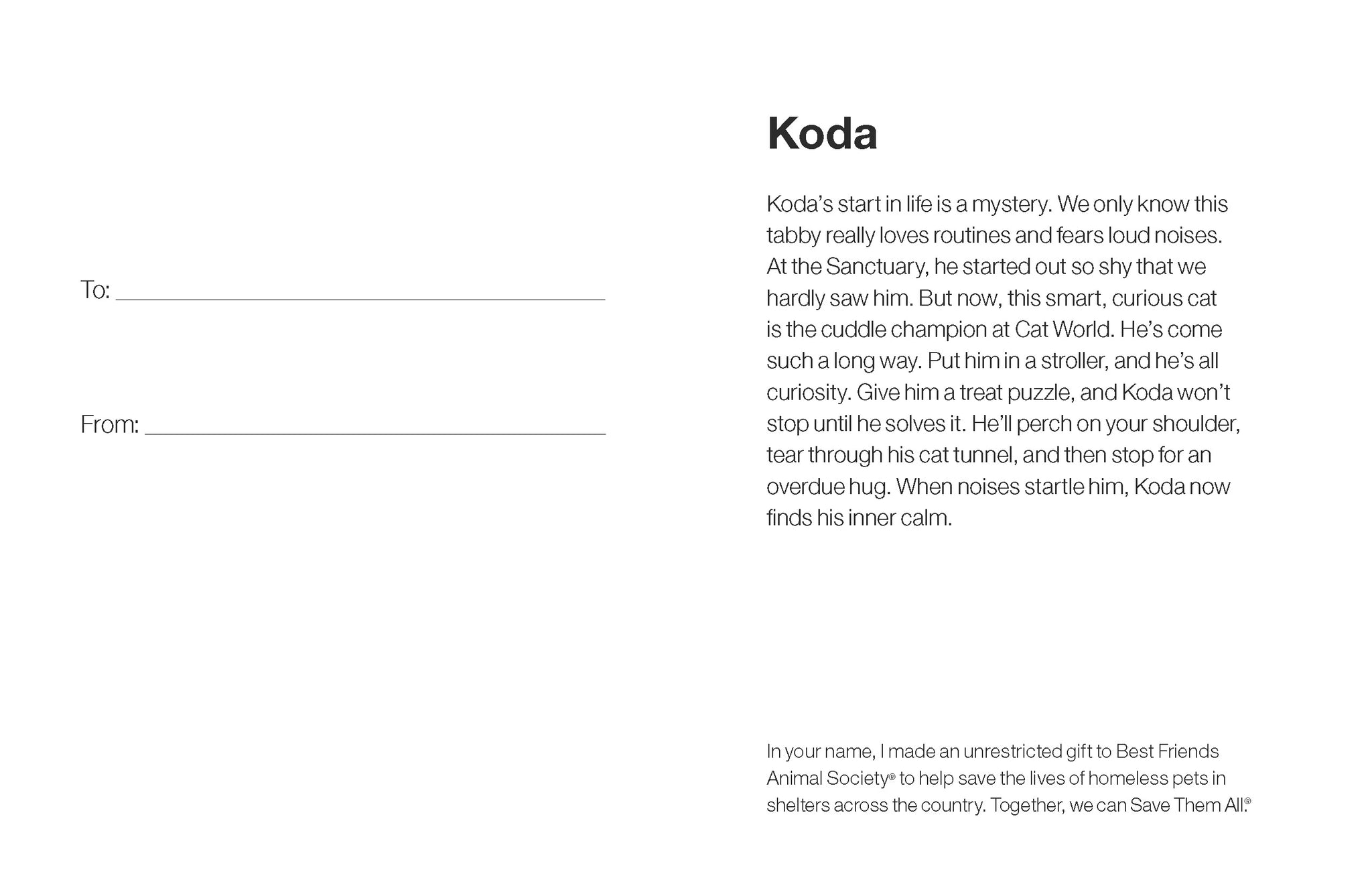 Koda’s start in life is a mystery. We only know this tabby really loves routines and fears loud noises. At the Sanctuary, he started out so shy that we hardly saw him. But now, this smart, curious cat is the cuddle champion at Cat World. He’s come such a long way. Put him in a stroller, and he’s all curiosity. Give him a treat puzzle, and Koda won’t stop until he solves it. He’ll perch on your shoulder, tear through his cat tunnel, and then stop for an overdue hug. When noises startle him, Koda now finds his inner calm.